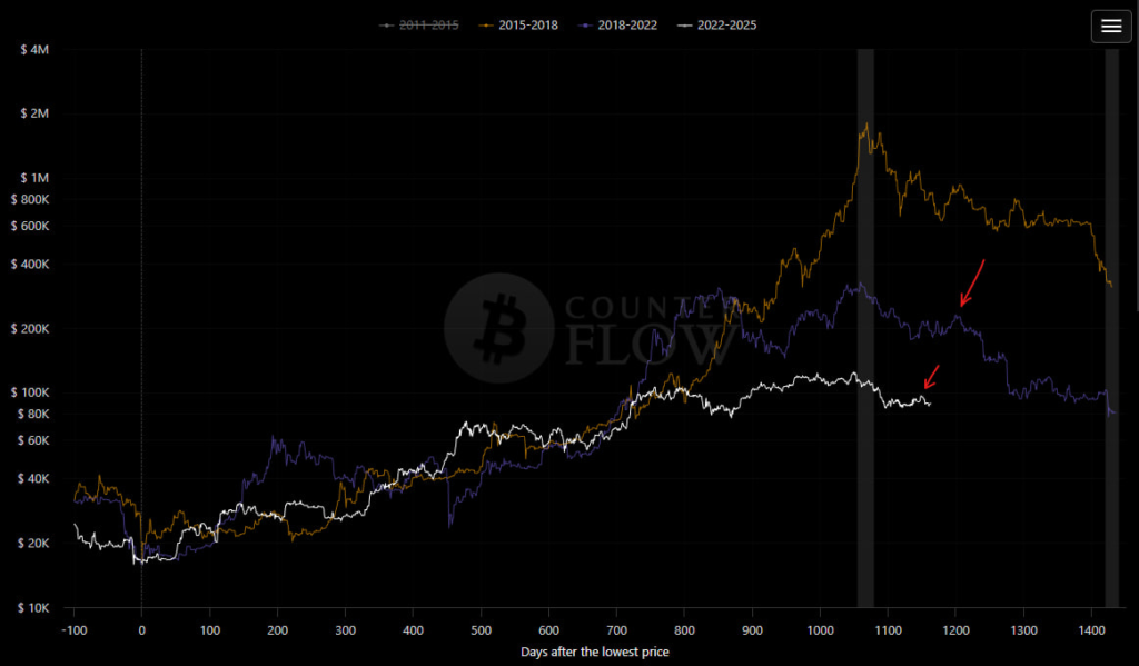 When we align Bitcoin cycles starting from the absolute low, a very familiar pattern appears.